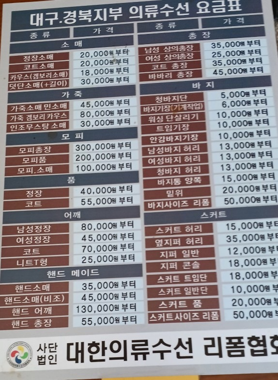 어릴 때는 동네 수선 가게에서 바지를 줄인 경험이 몇번 있는데, 요즘은 옷을 수선한 게 전혀 없고 살고 있는 곳은 수선 가게가 어딘지 비용이 얼마인지 아무것도 모르겠어요.그러다가 전에 이용한 세탁소 고에 수선 서비스도 있었음을 생각하고 맡기고 보았습니다.